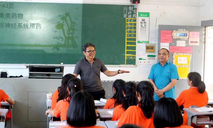 邓博士还走进课堂,与湘麓的孩子们互动交流,邓博士非常随和,谈美国的日常生活,说自己的成长经历,勉励孩子们认真学习医学药学知识,掌握扎实技能。孩子们听得聚精会神,争先恐后提问。最后,邓博士与孩子们进行了英文对话,一起唱起来了英文歌曲,氛围融洽热烈。