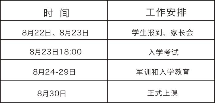 8月24-29日军训和入学教育,8月30日正式上课。军训和入学教育作为学校教育孩子的第一堂课非常重要,没有参加军训和入学教育的学生不能入学。