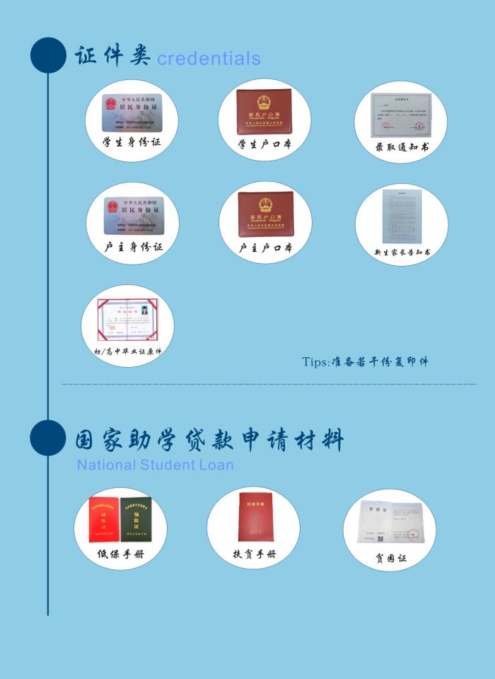 来校报到时请携带学生身份证、户口本原件(复印件各6份),户主身份证、户口本复印件各2份,以便办理注册及国家免学费手续;家里有低保手册、扶贫手册、贫困证的需提供相应复印件各3份,以便申请国家助学金;就读两年制中专的高中毕业生需提供高中毕业证原件,就读三年制中专的学生需提供初中毕业证原件。