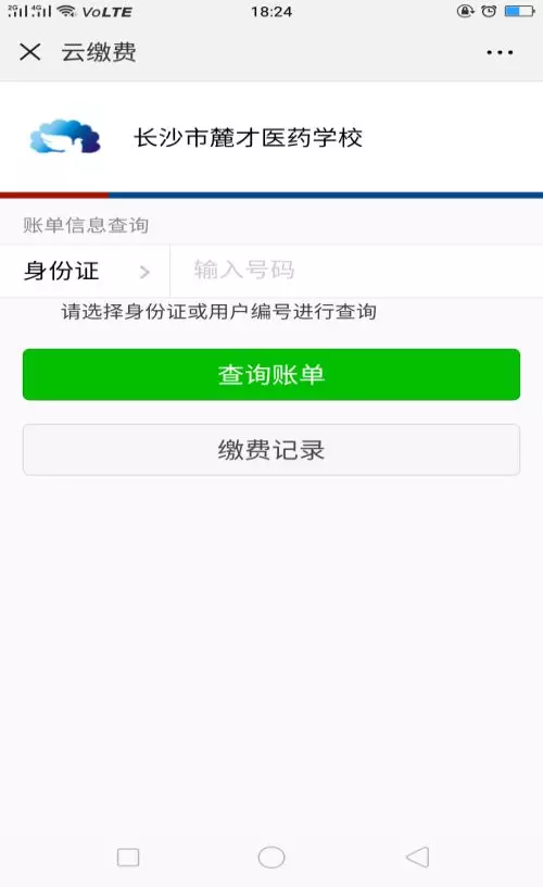 第三步:进入云缴费界面,输入学生的身份证号码,点击“查询账单”。会弹出学生的姓名,以及两份账单。若查询失败,可能是学生当初提供的身份证号码有误或者未提供身份证号码。这种情况只能在开学当日到学校来现场缴费。