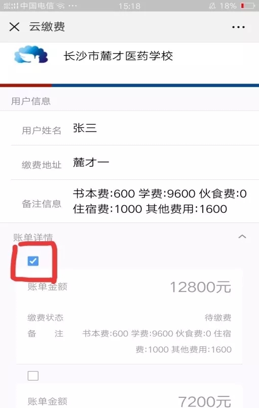 情况二:当选择缴纳一期的学杂费7200元档时(已经预交了1000元学费的学生,系统会自动变为6200元)