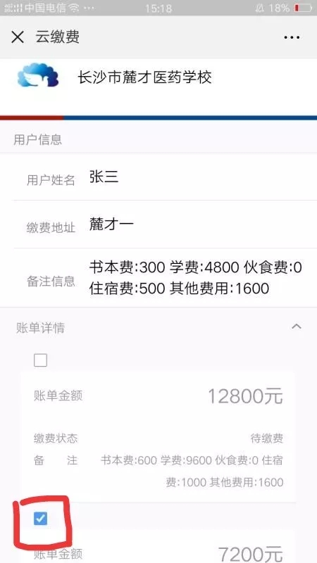 第四步:请家长仔细核对名字是否正确。核对无误后,选择缴纳一期或是一年的学费,在相应金额前面的方框内勾选。切勿全选,具体操作步骤如下: