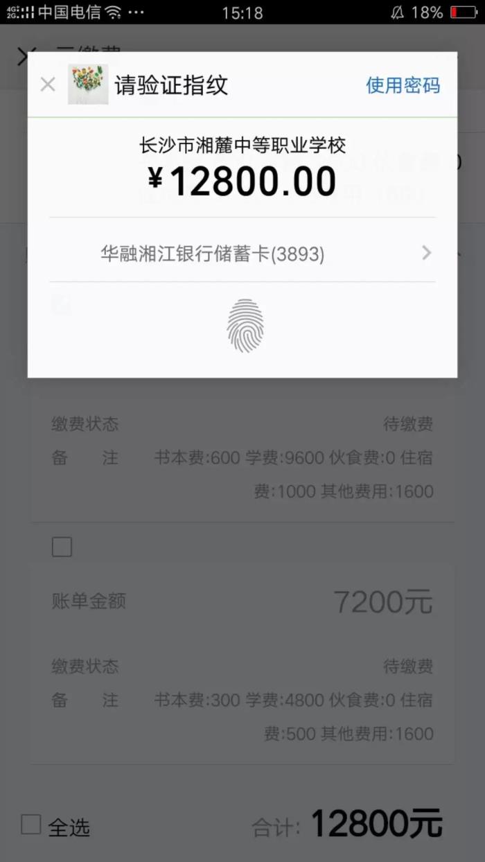 第五步:微信弹出付款页面,并再次回显此次缴费的总金额数,请学生家长再次核对,核对无误点击“确认支付”,输入密码或者指纹,完成付款操作。