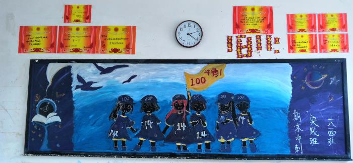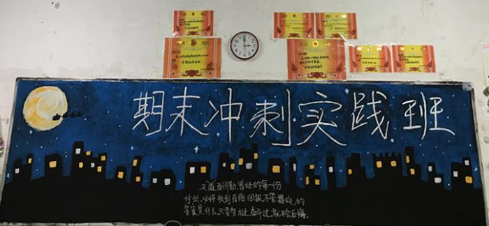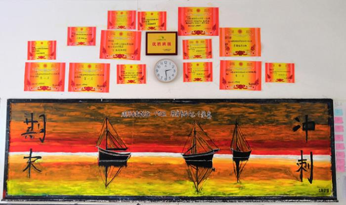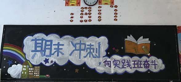 教室后面,每个班级都精心绘制了期末冲刺黑板报,鲜明的色彩和醒目的冲刺,让孩子们充满干劲和自信。