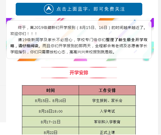 学校微信公众号及官网上,都有详尽的开学报到指南及军训准备安排,敬请查阅。