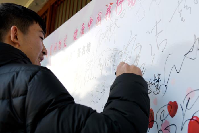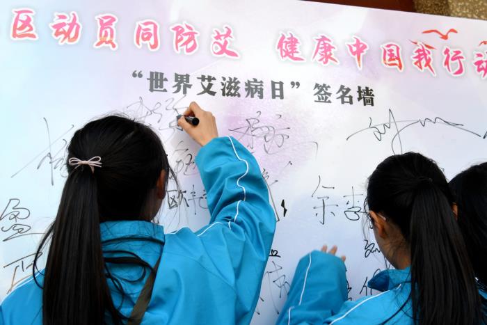 湘麓学生在防艾签名墙上签上自己的名字,表明自己防艾抗艾的决心。