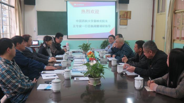 2017220日,国家执业药师发展研究中心专家顾问康震、中国药科大学继续教育学院章映欢院长一行莅临湘麓考察调研,易军、贺树华校长陪同。