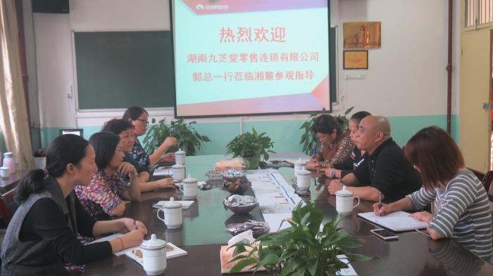 桂香盈人育金秋,馥郁气息满校园。2017年10月9日,湖南九芝堂零售连锁有限公司郭彩虹女士率企业高管团队莅临湘麓洽谈校企合作,易军校长全程陪同。
