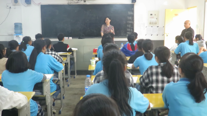 郭彩虹女士走上实践41班的讲台,向学生介绍了“九芝堂”这个百年老字号医药品牌的实力,而且表示非常看好湘麓的教育教学模式,她欢迎学生们到九芝堂去实习和工作。