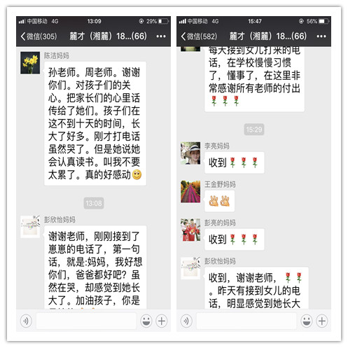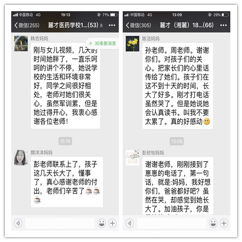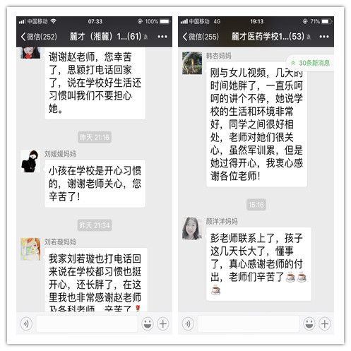 从新生入学报到、军训、上课至今将近20天时间,没有放假,只在某个星期天下午发放了几个小时的手机,孩子们能适应吗?这应该是大部分家长最为担心和焦虑的。发放手机的那天下午,孩子们第一时间联系了爸爸妈妈,看看孩子们的反馈吧——