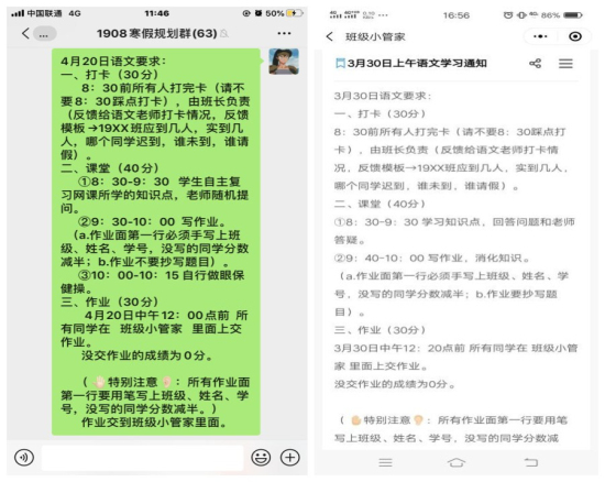 如1908班,老师会要求学生每日8:30之前必须在微信群完成打卡,并会提前一天在班级群中发布学习内容与时间安排。4月8日邱爽老师在下午5点发布4月9日上午语文课的安排,回复收到的学生只有35人。针对这种现象,第二天邱老师在课堂总结时作出了提醒,之后学生基本能及时回复消息。