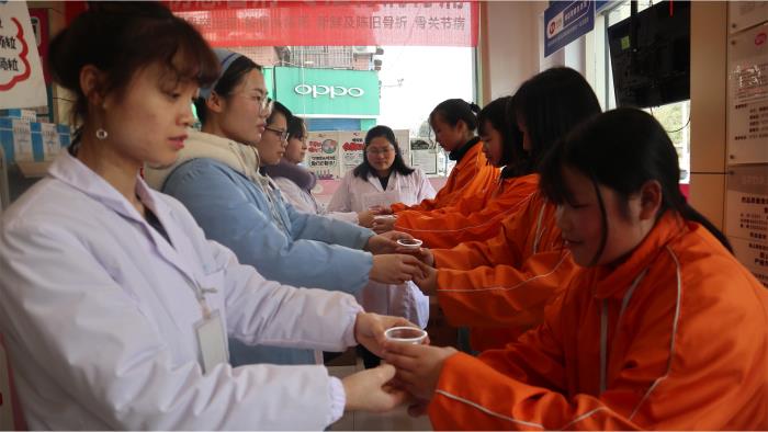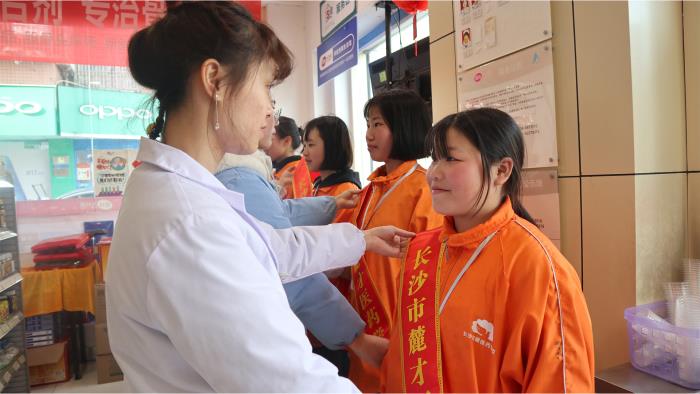 “师傅好,我是1751班单露,请喝茶!”在麓才(湘麓)学校实践基地诺舟大药房,师傅和徒弟(学生)面对面整齐站立,徒弟双手给师傅敬上一杯茶,师傅为徒弟佩戴实践绶带……